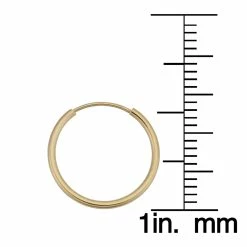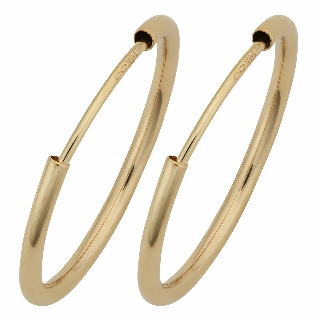 These simple, delicate gold hoop earrings are crafted of high polish finished 14k yellow gold and features a lightweight with several sizes to choose from. Ideal for babies to adults, the endless hoop design of this 14k gold hoop earrings makes it more secure while wearing them. The simplicity of this pair of 14 karat gold endless hoop earrings makes it an excellent everyday accessory.