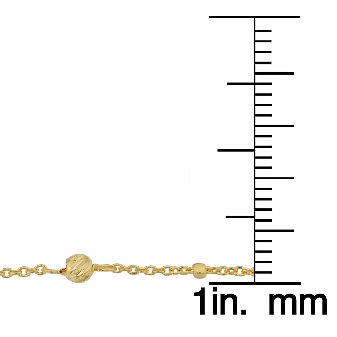 A stunning, eye catching piece that showcases a radiant glow. This gold anklet is crafted in 14k yellow gold and features a station of cube and beads on cable chain. A perfect accessory with dresses, skirt, short pants, and the likes, this 14k gold anklet is the perfect summer accessory.