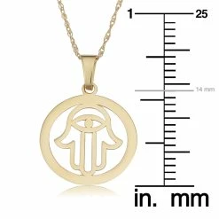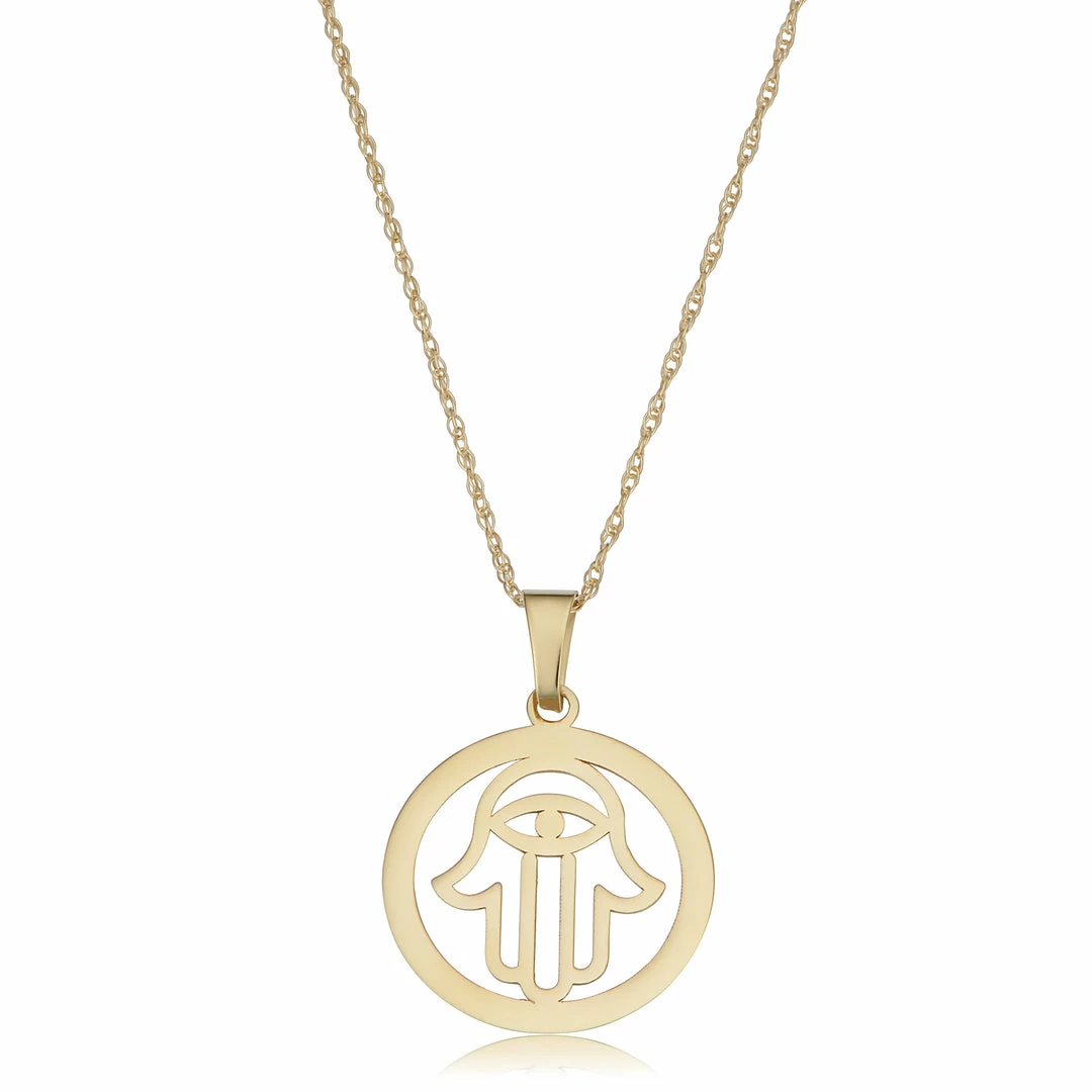 - SIMPLE, ELEGANT GOLD JEWELRY FOR WOMEN. A gold round pendant with Hamsa design is showcased in this 14k gold necklace for women and it dangles on an 18-inch gold rope chain necklace that secures with a spring ring clasp
