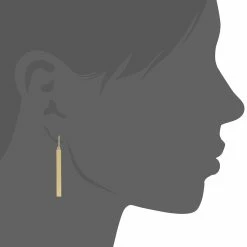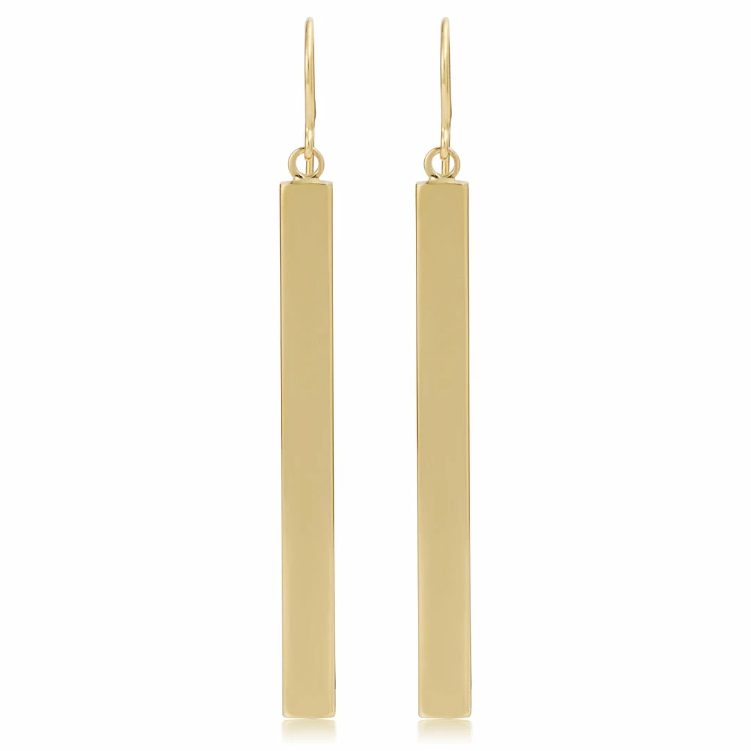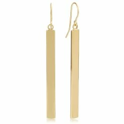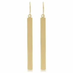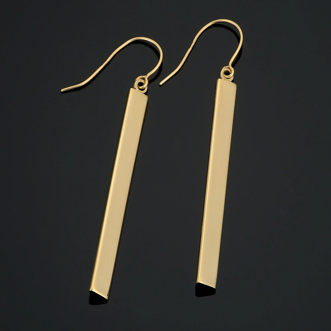 - An eye catching pair of earrings that will sure to add shine and glamour to any attire as this pair of gold dangle earrings showcases a vertical gold bar that dangles on a gold hook.